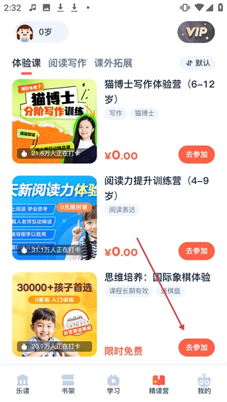 在課程列表頁面,找到“思維培養(yǎng):國際象棋體驗(yàn)”這門課程,然后點(diǎn)擊它對(duì)應(yīng)的“去參加”按鈕。