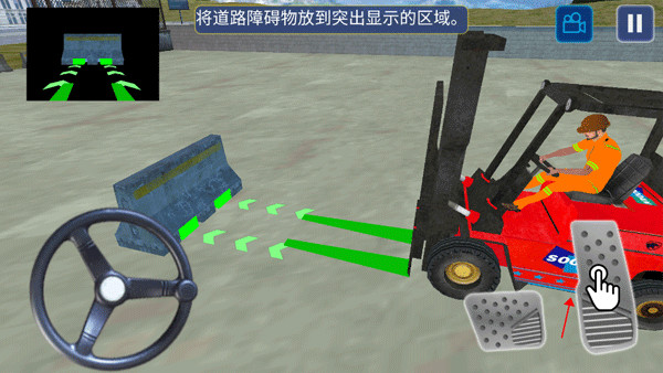 6、第二關(guān)是將道路上的障礙物放到突出顯示的區(qū)域,點擊油門將叉車靠近到障礙物。