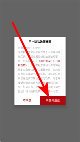 打開溫度新聞,在彈窗中點(diǎn)擊同意并繼續(xù)。