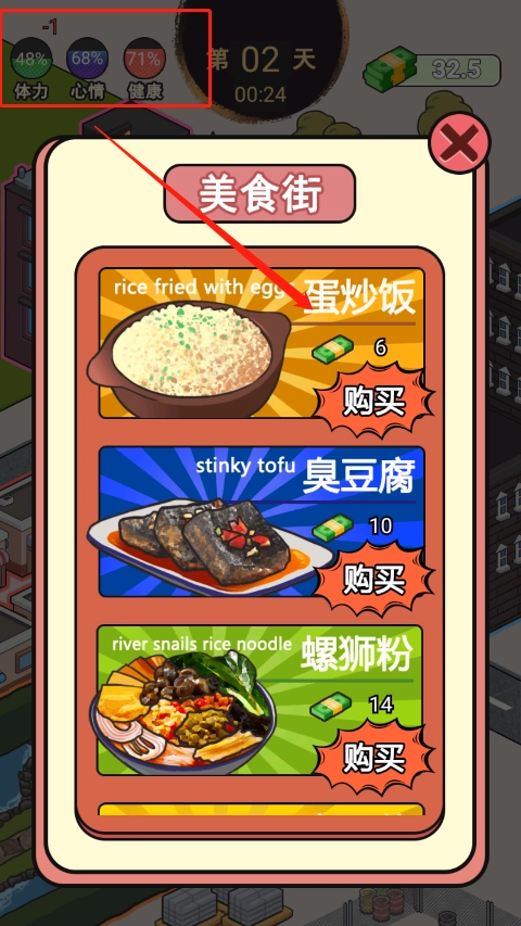 游戲里玩家的體力、心情和健康值都會隨時間推移逐漸下降,當(dāng)賺到鈔票后,我們可以花費鈔票去購買各類食物或參與不同活動,以此提升這些屬性的數(shù)值。