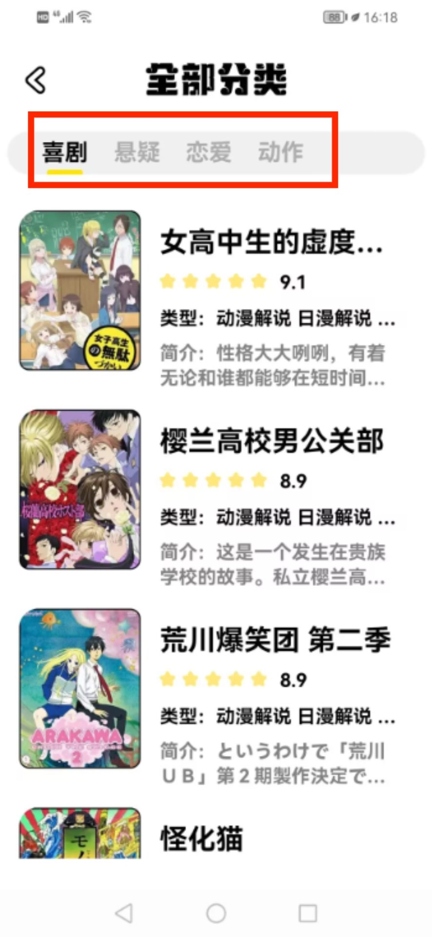 啟動應(yīng)用程序后,會進(jìn)入分類總覽界面,此時(shí)選擇喜劇標(biāo)簽,即可瀏覽對應(yīng)的動畫作品。