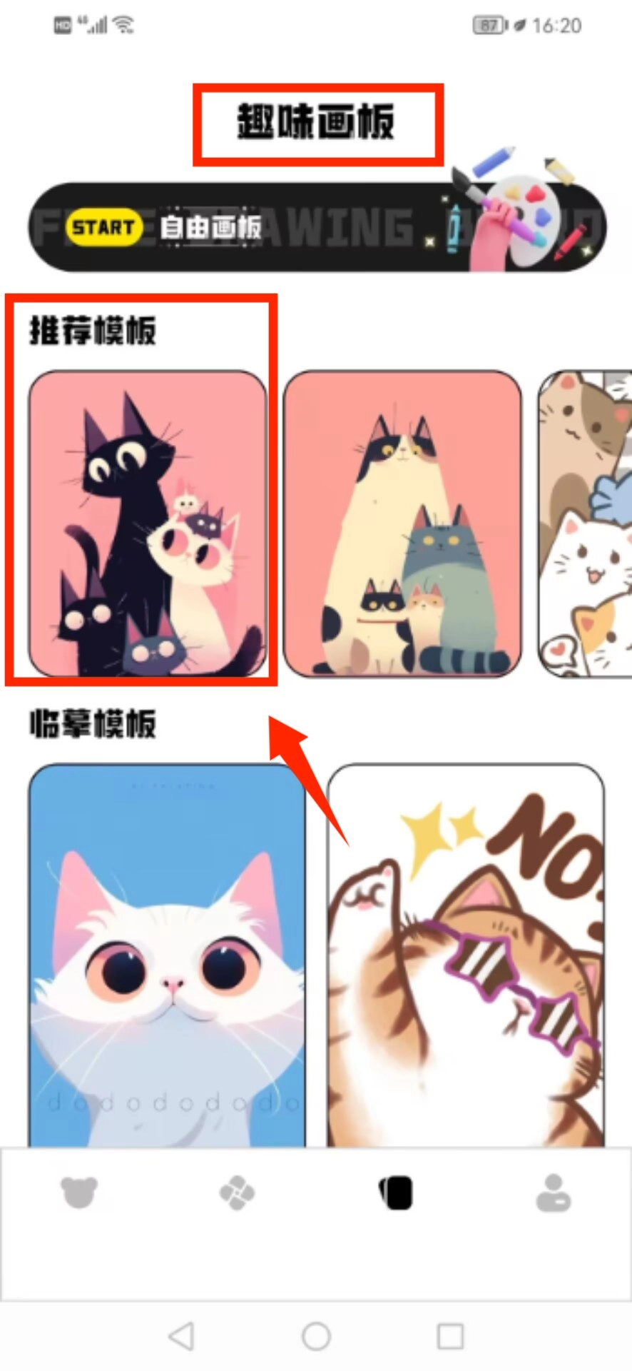 切換到趣味畫板功能區(qū),從推薦圖庫中挑選你喜歡的貓咪樣式模板。