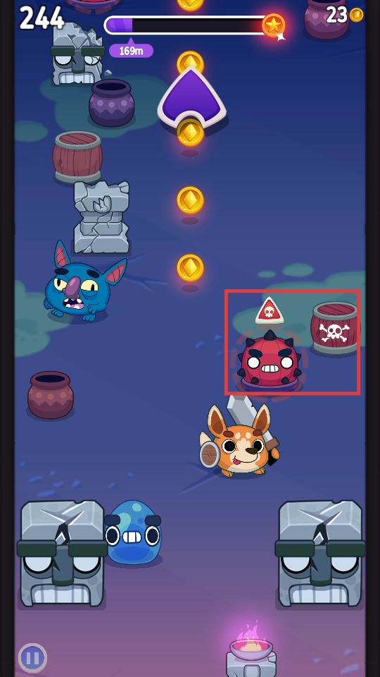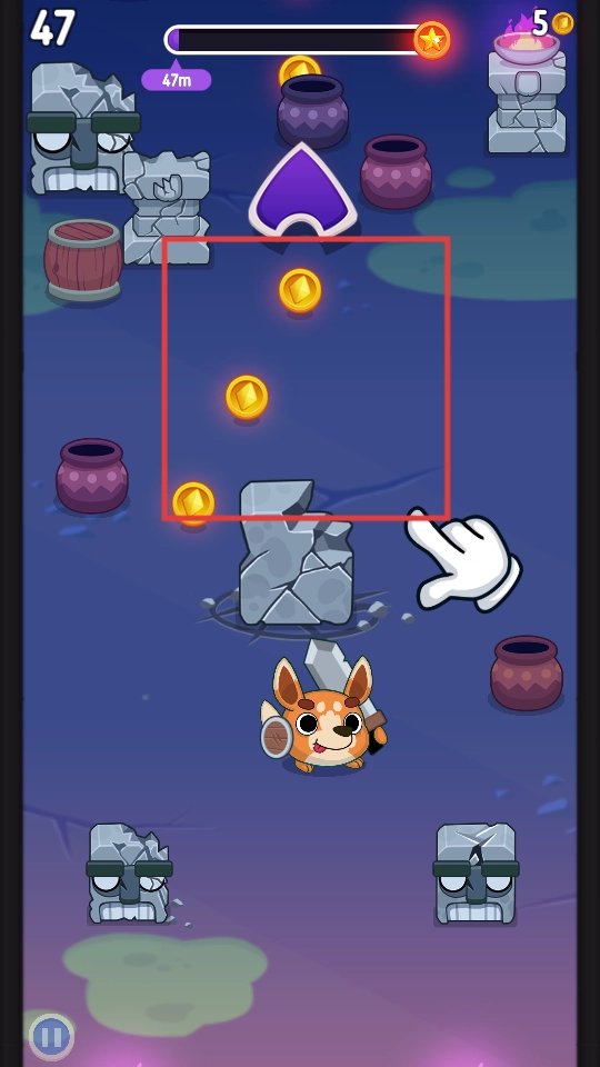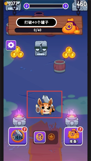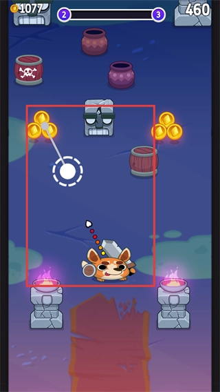 通過滑動操作來控制角色的發(fā)射方向,當擊中場景里的【罐子】【木箱】這類物體時,就可以獲得相應的【金幣】獎勵。