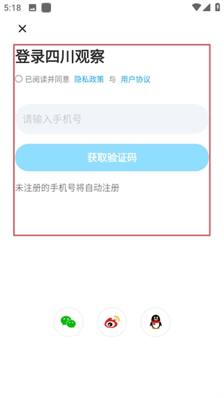 在個人頁面,點擊手機圖標,即可進入四川觀察的登錄界面。