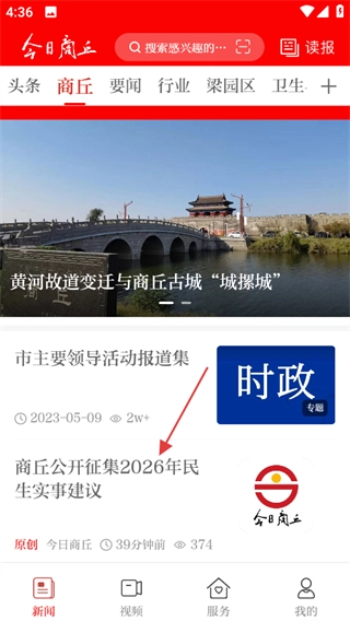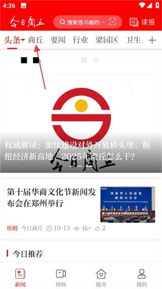 打開軟件的新聞頁面后,找到并點(diǎn)擊“商丘”標(biāo)簽,即可切換至商丘相關(guān)的新聞頁面。