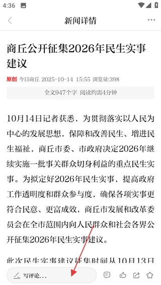 在新聞詳情頁,點(diǎn)擊寫評(píng)論,進(jìn)入評(píng)論輸入頁面。