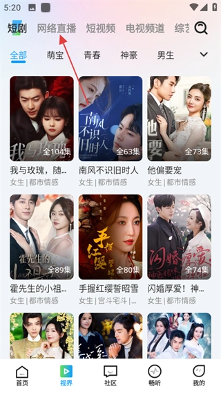 在視界頁面,點(diǎn)擊網(wǎng)絡(luò)直播,進(jìn)入網(wǎng)絡(luò)直播頁面。