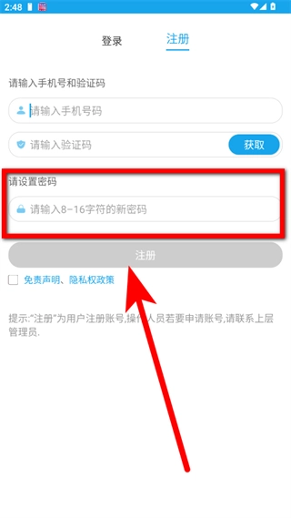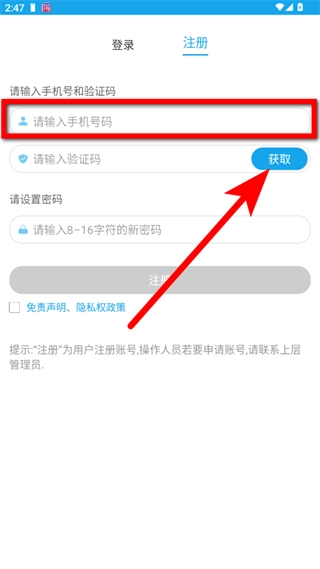 在注冊頁面,輸入手機(jī)號(hào)碼后,點(diǎn)擊獲取驗(yàn)證碼。