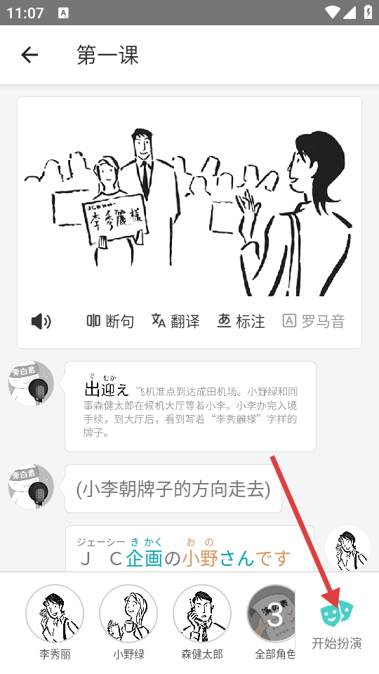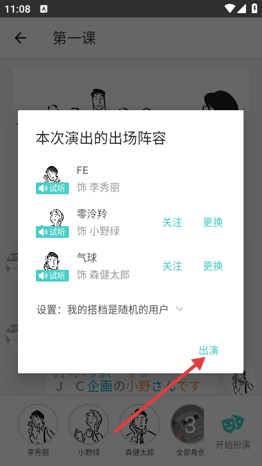 在第一課的學習頁面中,找到右下角的“開始扮演”按鈕并點擊,即可進入演出陣容的選擇頁面。