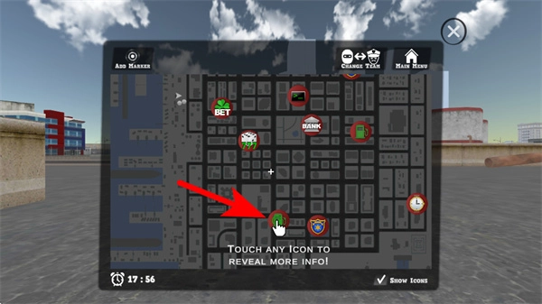 在完整地圖界面中,按照紅色箭頭的指引操作,點(diǎn)擊任意一個(gè)圖標(biāo),即可查看該圖標(biāo)的詳細(xì)內(nèi)容,從而清晰了解需要執(zhí)行的行動(dòng)目標(biāo)。