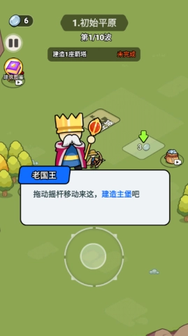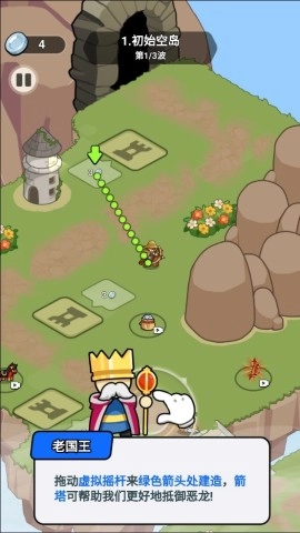 拖動虛擬搖桿確定建筑位置,選擇在綠色箭頭指示的地方建造箭塔,這樣能增強防御效果。