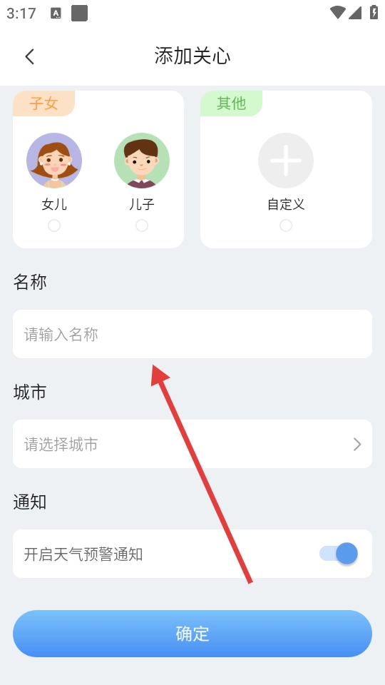 在添加關(guān)心頁面,依次完成分類選擇、名稱輸入、城市選定以及天氣預(yù)警通知的設(shè)置后,點(diǎn)擊【確定】按鈕,就能成功添加關(guān)心信息。