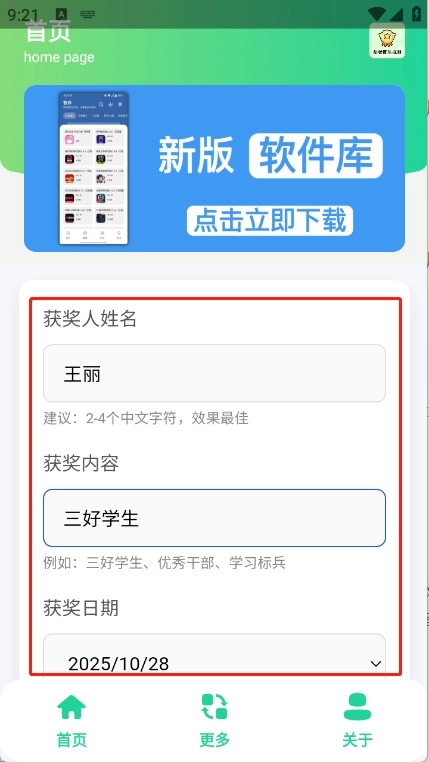 進入首頁之后輸入獲獎人姓名以及獲獎內(nèi)容等信息。
