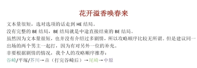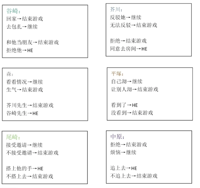 游戲的繼續(xù)進(jìn)行需要選擇正確的選項(xiàng),每條路線僅有兩個(gè)選項(xiàng)且十分簡單,一旦選錯(cuò)就會(huì)直接進(jìn)入中斷的be結(jié)局(所有be都沒有CG)