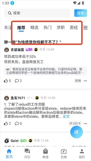 打開軟件進(jìn)入后,在首頁(yè)能看到精選、推薦、熱門、求職等板塊的內(nèi)容。