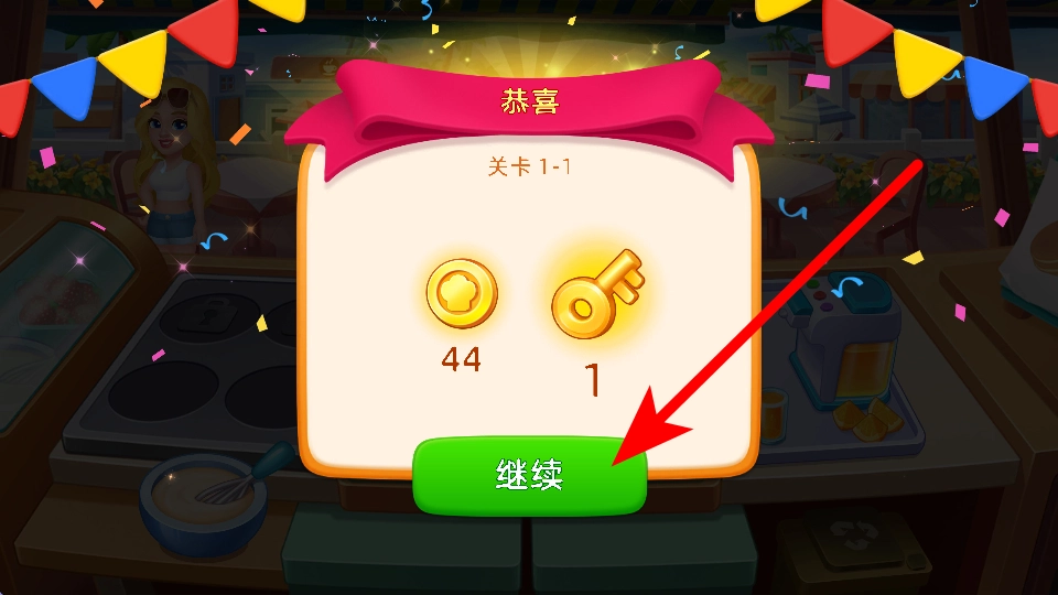 成功闖過(guò)關(guān)卡后,能得到金幣、鑰匙這類獎(jiǎng)勵(lì),點(diǎn)擊繼續(xù)按鈕,就能開(kāi)啟下一個(gè)關(guān)卡,繼續(xù)經(jīng)營(yíng)餐廳的旅程,還可以解鎖更多新餐品或者餐廳相關(guān)內(nèi)容。