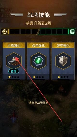 戰(zhàn)機完成升級后,會出現(xiàn)戰(zhàn)場技能選擇界面,玩家可在主炮強化、必殺強化、裝甲強化這三個選項中挑選技能,以此增強自身戰(zhàn)力。