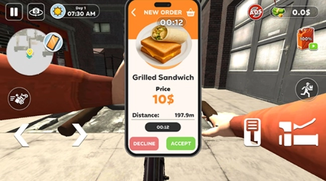 核心定位:一款高度擬真的外賣配送模擬經(jīng)營游戲,玩家將化身為外賣騎手,在規(guī)定時間內(nèi)完成訂單配送任務,借助合理的路線規(guī)劃、嫻熟的駕駛技巧以及優(yōu)質(zhì)的服務質(zhì)量,來提高自身評分并增加收入。