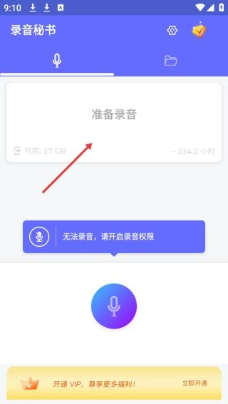 在本站完成安裝后點(diǎn)擊打開進(jìn)入,進(jìn)入主界面后會(huì)顯示“準(zhǔn)備錄音”,界面下方提示“因未開啟錄音權(quán)限無法錄音”,同時(shí)設(shè)有開通VIP的入口。