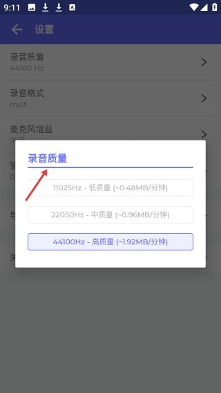 在錄音質(zhì)量設(shè)置界面進(jìn)行點(diǎn)擊操作后,會(huì)呈現(xiàn)出低、中、高三種可供選擇的質(zhì)量選項(xiàng),這三種選項(xiàng)各自對(duì)應(yīng)著不同的采樣率以及每分鐘所占用的存儲(chǔ)空間。