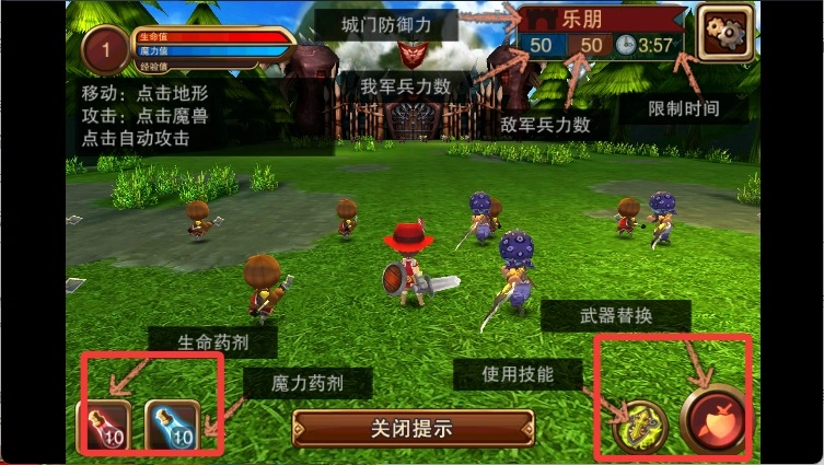 進入游戲后,能看到提示介紹各個圖標(biāo)的功能,點擊屏幕就能操控角色移動。