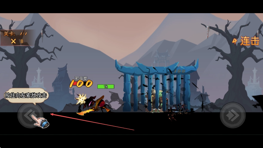 進入游戲后,按照提示按住向左的索敵攻擊鍵,然后點擊屏幕左側的方向按鈕,即可對敵人邪骨草發(fā)起攻擊。
