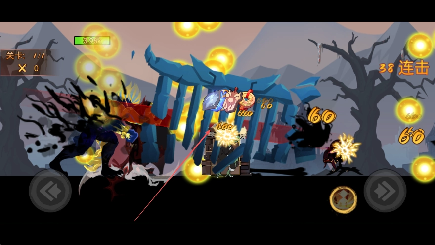 基礎格斗與操控:使用虛擬搖桿來控制火柴人的移動方向,點擊攻擊按鈕就能施展基礎的格斗招式,利用跳躍鍵可以避開敵方的攻擊,或者抵達較高的地形位置。借助物理引擎的特性,還能通過先跳躍再向下沖擊的方式,完成跳躍攻擊的動作。