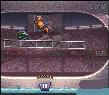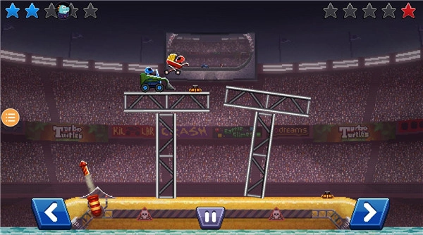 在高塔這類場景中,玩家得先確保賽車穩(wěn)穩(wěn)停住不墜落,再伺機(jī)撞擊對手;一旦掉下去,賽車必然會解體,進(jìn)而失去積分。