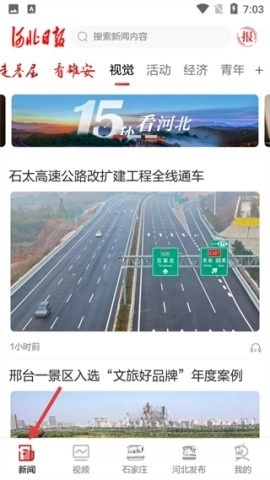 新聞板塊設(shè)有走基層、看雄安等頻道,涵蓋石太高速公路改擴建通車、邢臺景區(qū)入選文旅案例等多方面資訊,并且提供新聞內(nèi)容搜索功能。