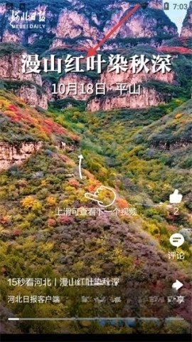 視頻板塊呈現(xiàn)了平山漫山紅葉等精彩視頻內(nèi)容,用戶可通過上滑瀏覽更多視頻,同時支持點贊、評論、分享功能,還能查看相關(guān)詳細信息。