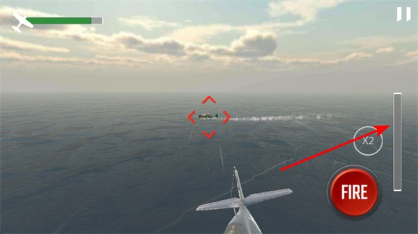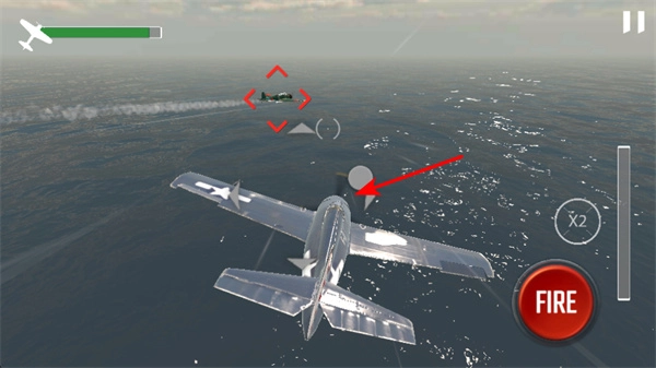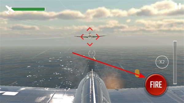 對(duì)準(zhǔn)敵方發(fā)起攻擊,鎖定敵方戰(zhàn)機(jī)后,按下FIRE按鈕發(fā)射彈藥,以此對(duì)敵方造成傷害。