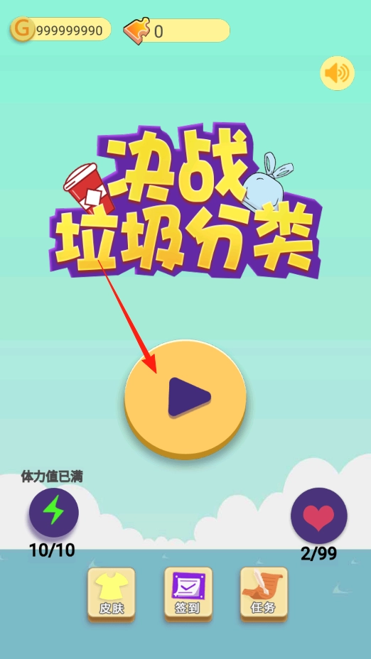 打開游戲后,映入眼簾的是“決戰(zhàn)垃圾分類”的標題和播放按鈕,點擊黃色按鈕即可進入垃圾分類關(guān)卡。消耗金幣和體力值后開始挑戰(zhàn),將垃圾進行正確分類就能贏取獎勵。