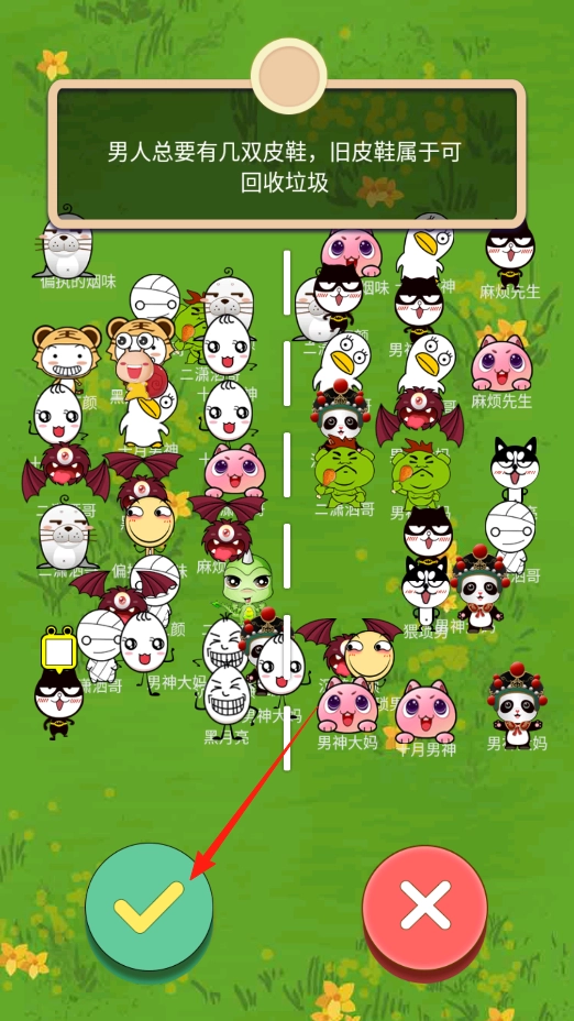 進入關(guān)卡后,屏幕上方會出現(xiàn)垃圾分類的題目,比如提示舊皮鞋屬于可回收垃圾。此時需要在兩側(cè)的卡通角色中,找到代表可回收垃圾的那一個,選定后點擊綠色的對勾按鈕。如果選擇正確就能獲得分數(shù),要是選錯了則需要重新選擇,整個過程是對垃圾分類知識的考驗。
