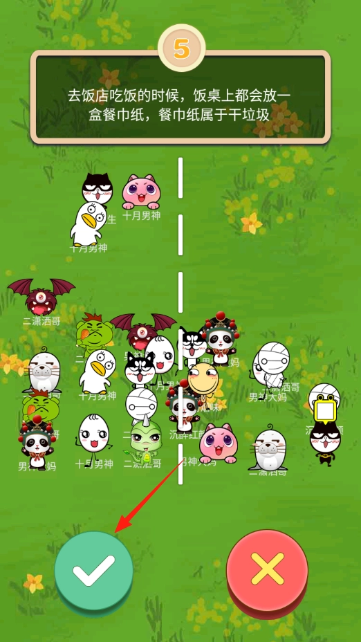 新關(guān)卡的題目設(shè)定為“餐巾紙屬于干垃圾”,玩家需要在卡通角色里找出對應(yīng)干垃圾的代表形象。選定后點擊綠色對勾提交答案,答對即可進入下一題,答錯則需重新開始。通過這種邊玩邊學(xué)的方式,玩家能在游戲過程中學(xué)習(xí)垃圾分類知識,逐步積累相關(guān)認知。