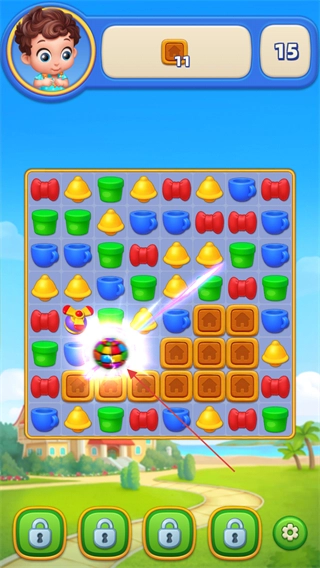 當(dāng)遇到彩色球這類特殊道具時(shí),通過點(diǎn)擊或者達(dá)成相應(yīng)條件來激活它的特效,從而清除更多的道具。