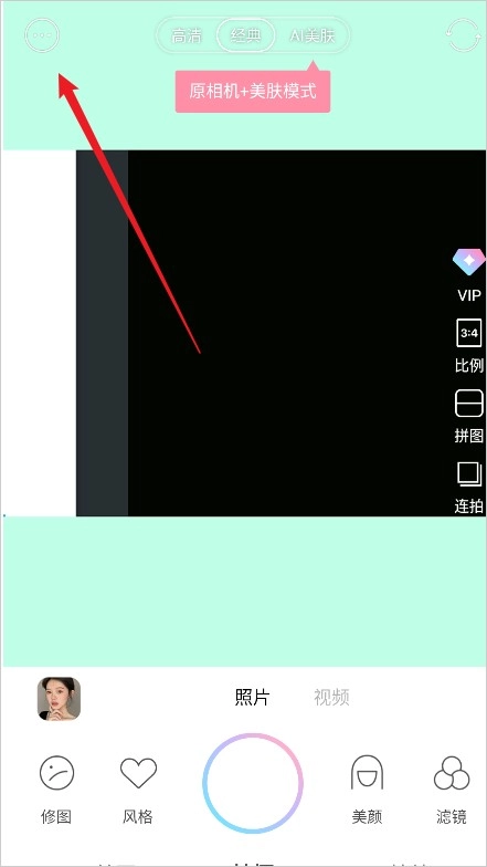 進(jìn)入甜鹽相機(jī)頁面后,首先點(diǎn)擊左上角三點(diǎn)標(biāo)識