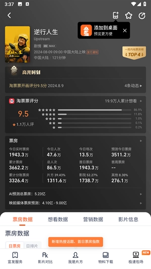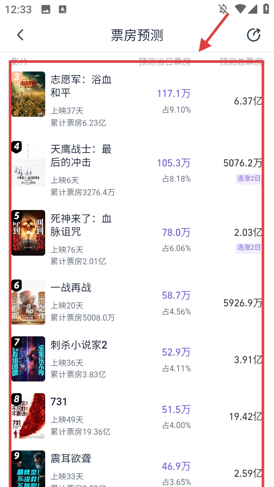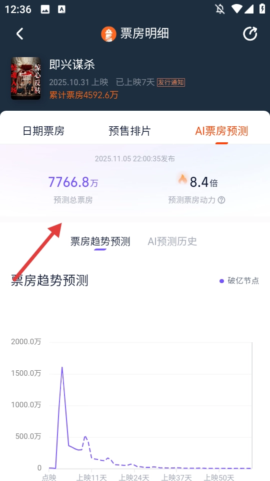 點(diǎn)擊目標(biāo)影片,進(jìn)入票房明細(xì)頁(yè)面,查看該影片的票房趨勢(shì)預(yù)測(cè)等詳細(xì)數(shù)據(jù)。
