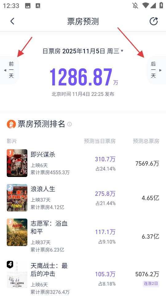 可點(diǎn)擊【前一天】或【后一天】按鈕切換日期,以查看不同日期的票房預(yù)測(cè)情況。