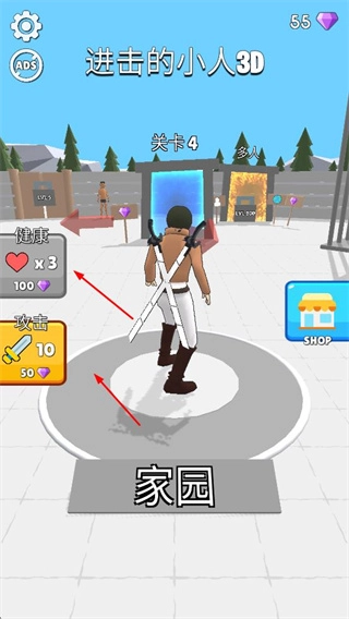 在游戲的家園等界面中,玩家可以查看角色的健康值、攻擊力等各項(xiàng)屬性;同時(shí),也能選擇進(jìn)入關(guān)卡4等不同關(guān)卡繼續(xù)進(jìn)行挑戰(zhàn),通過(guò)持續(xù)的戰(zhàn)斗來(lái)提升角色的實(shí)力,從而推動(dòng)游戲的整體進(jìn)程。