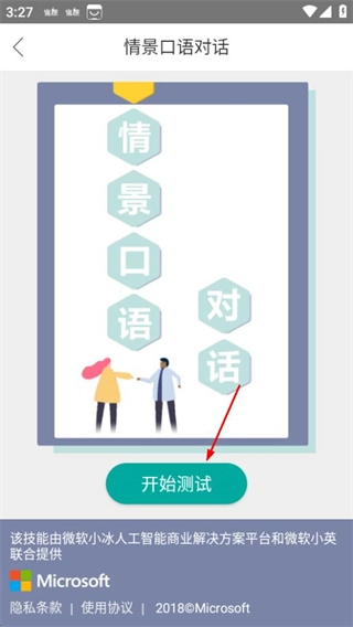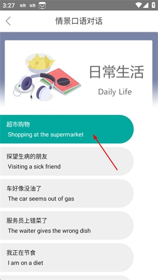 在測(cè)試情景選擇頁面,挑選你感興趣的情景(例如超市購(gòu)物),然后進(jìn)入對(duì)話練習(xí)頁面。