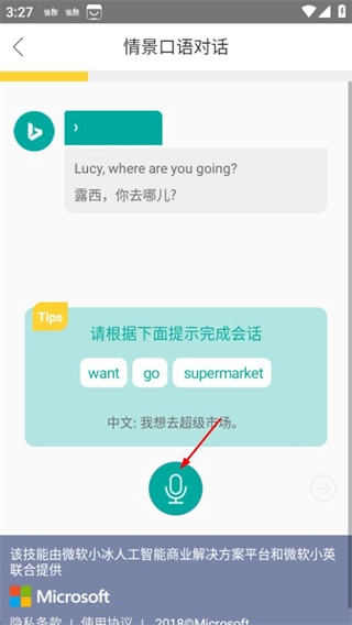 在對(duì)話練習(xí)頁面,點(diǎn)擊麥克風(fēng)圖標(biāo),就能開展口語對(duì)話練習(xí)。