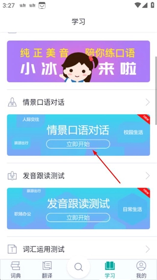在學(xué)習(xí)頁面,找到情景口語對(duì)話板塊,點(diǎn)擊其中的“立即開始”按鈕,即可進(jìn)入相應(yīng)頁面。
