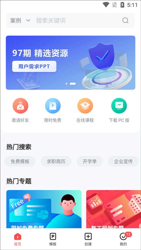 打開App首頁,就能看到“限時免費”“邀請好友賺福利”“在線課程學(xué)習(xí)”“PC端”等功能入口。平臺每日會推薦優(yōu)質(zhì)原創(chuàng)模板,還設(shè)有免費課堂,幫助你系統(tǒng)掌握PPT設(shè)計技巧,邊學(xué)邊用,成長清晰可見。