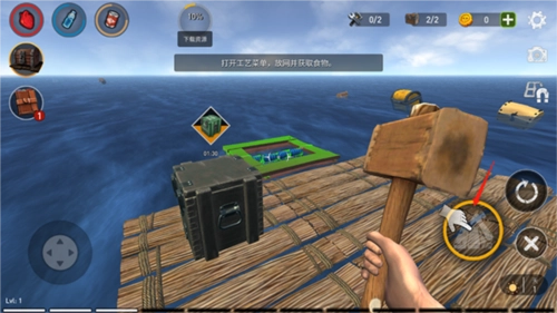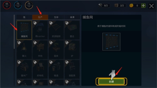 在海洋游獵生存游戲里打開工藝菜單,就可以設(shè)置捕魚網(wǎng)來獲取食物。