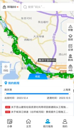 提供航線規(guī)劃、預(yù)警信息查詢、圖層切換、問題反饋、我的航程等服務(wù)??筛鶕?jù)船舶實時船位和航行計劃,智能推送水文氣象、交通管制、錨地、水上服務(wù)區(qū)、船廠、泊位等信息。