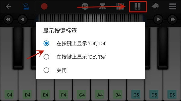 打開完美鋼琴,進(jìn)入彈奏界面后,點(diǎn)擊右上角的第三個(gè)圖標(biāo),就能設(shè)置讓按鍵上顯示數(shù)字了。