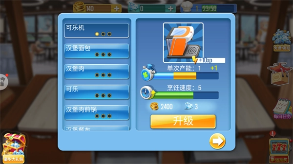 升級設(shè)備:花費(fèi)金幣和鉆石對制作設(shè)備進(jìn)行升級,能夠提高單次生產(chǎn)的數(shù)量以及烹飪的速度,從而提升美食制作的效率。