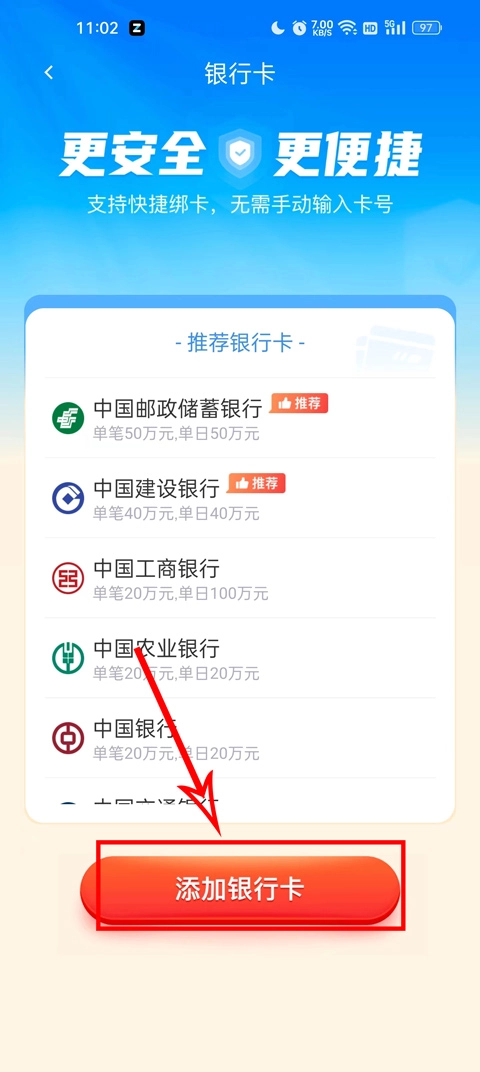 進(jìn)入之后我們會(huì)進(jìn)入銀行卡綁定頁面,點(diǎn)擊【添加銀行卡】;