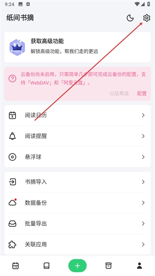 打開(kāi)紙間書(shū)摘應(yīng)用,在界面右上角找到設(shè)置圖標(biāo),點(diǎn)擊該圖標(biāo)即可進(jìn)入設(shè)置頁(yè)面。