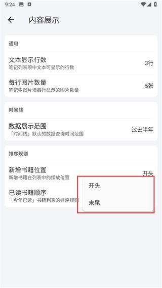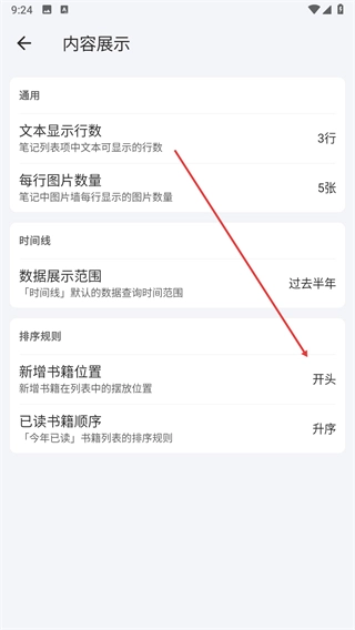 進(jìn)入內(nèi)容展示界面后,在排序規(guī)則板塊中找到新增書(shū)籍位置的相關(guān)選項(xiàng)。